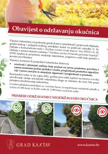 Vlasnici nekretnina na području grada Kastva (stambenih i poslovnih objekata, građevinskog i poljoprivrednog zemljišta) dužni su poštivati odredbe čl. 16. Odluke o komunalnom redu („Službene novine Grada Kastva“ broj 09/19) i čl. 22. Odluke o nerazvrstanim cestama (“Službene novine Primorsko-goranske županije” 02/96) kojima je propisano uređenje nekretnina, pogotovo onih koje graniče s javnim površinama.